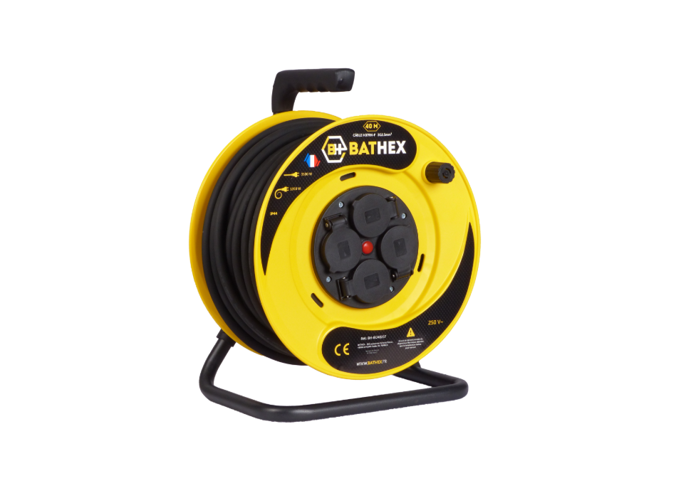 • Câble normalisé HAR de type H07RNF isolé à 700 Volts • Prise surmoulée 16A / 250V • Frein sur tambour • Disjoncteur thermique